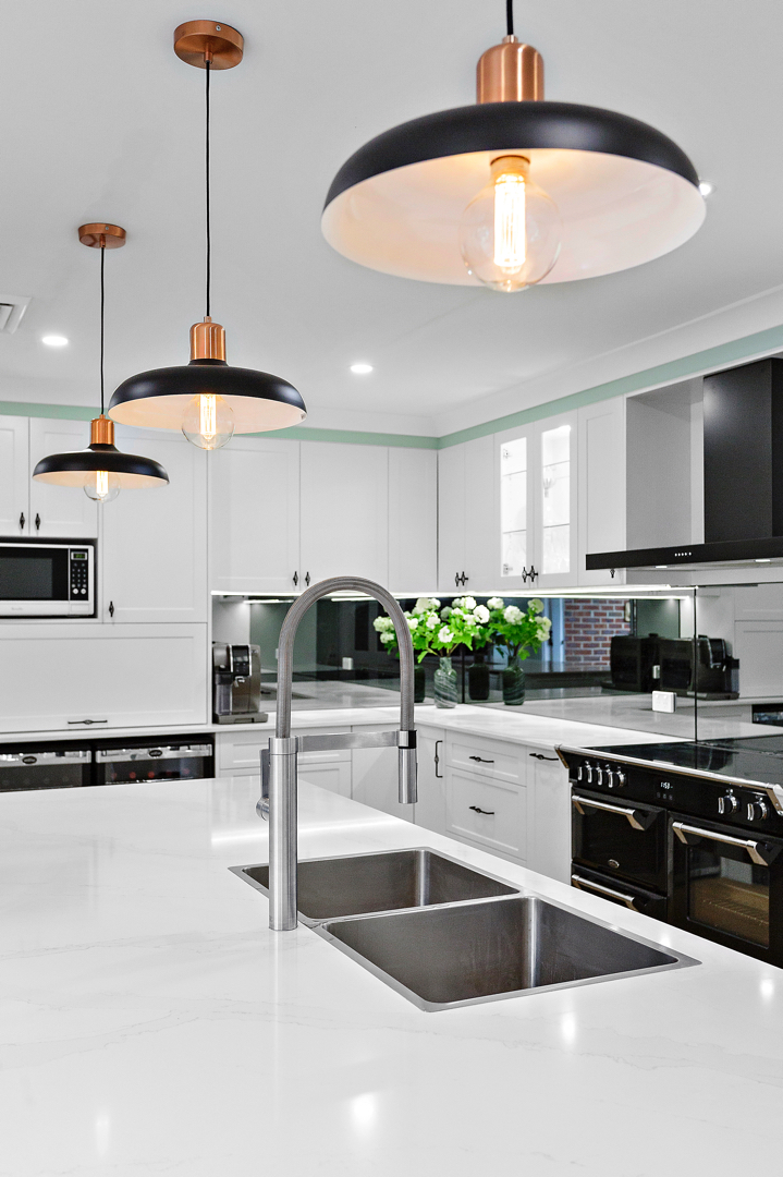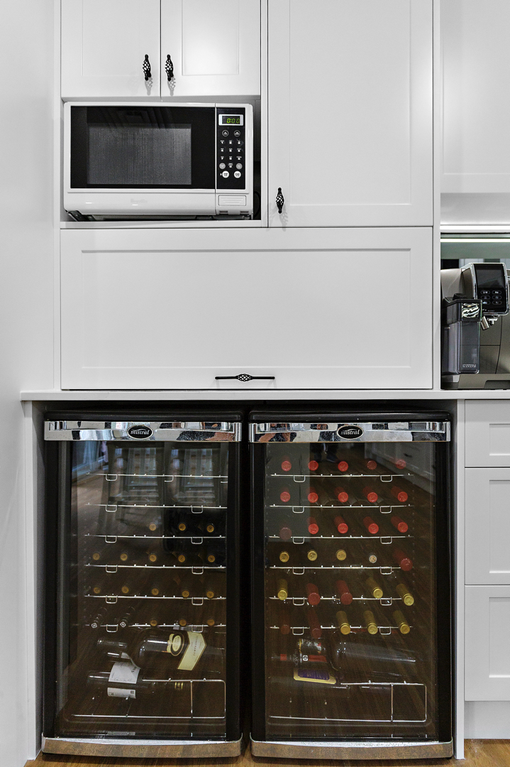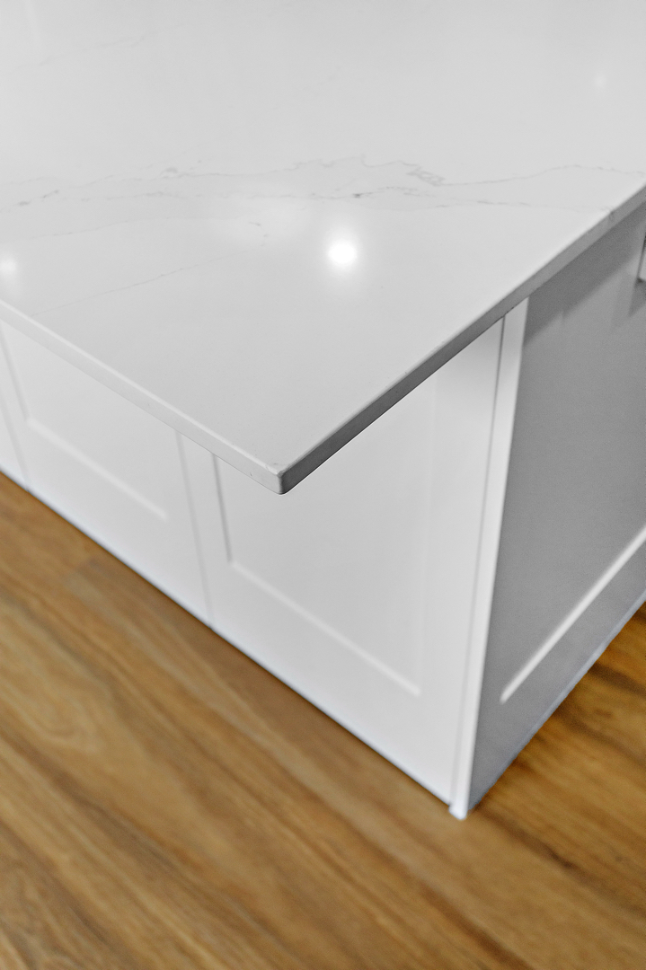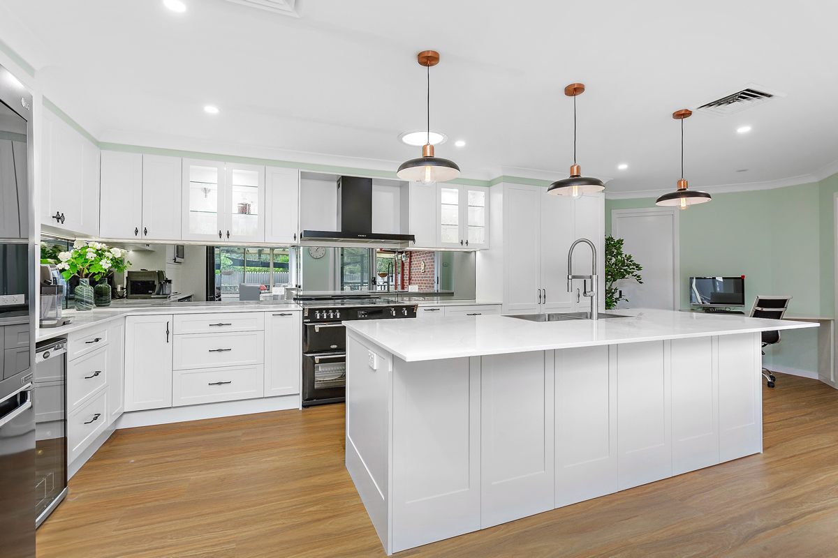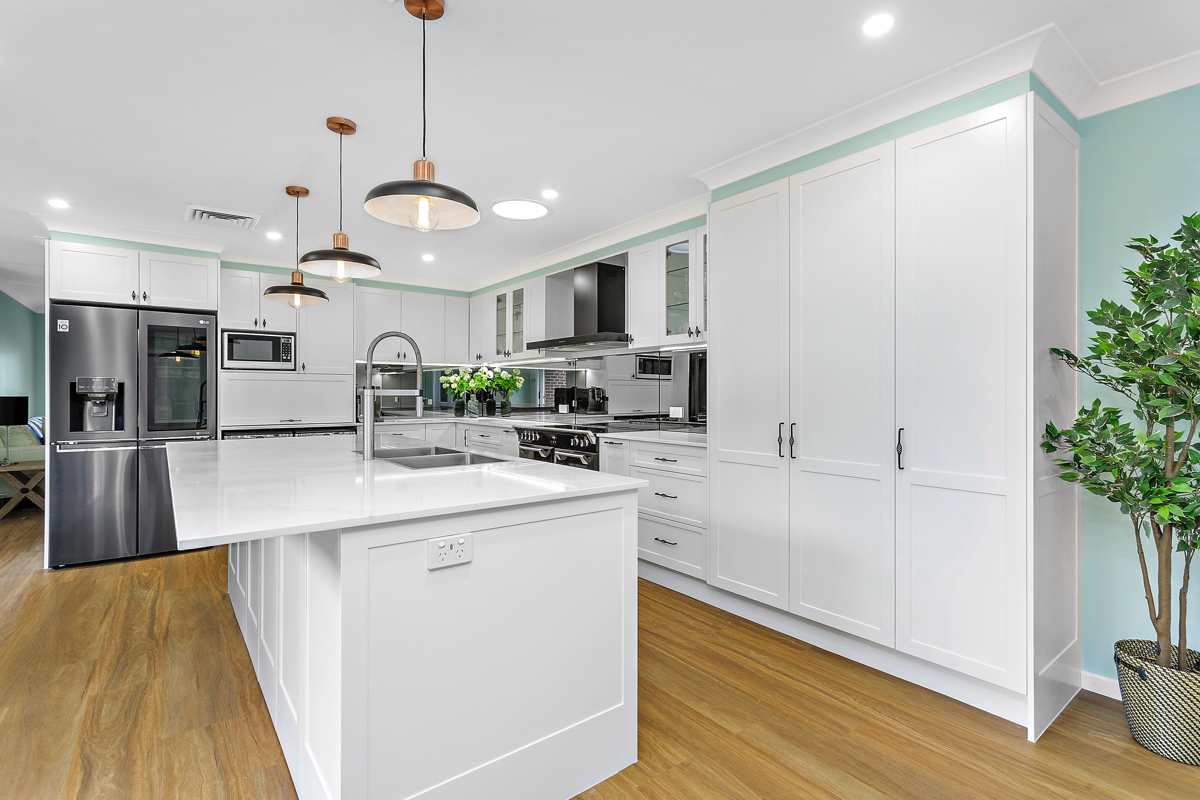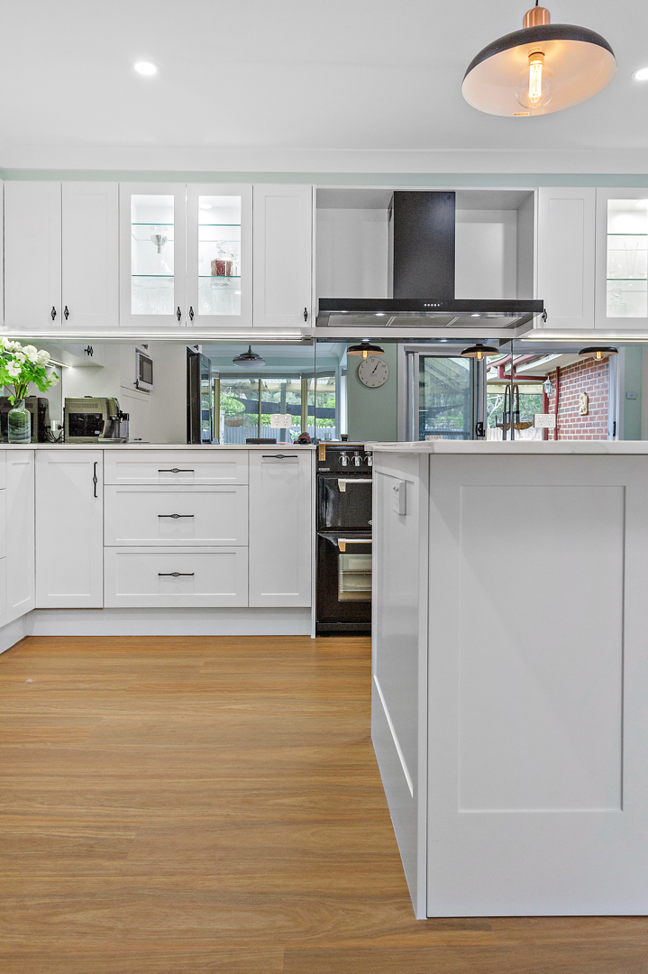 Crafted with care, this project centres on a functional, classic kitchen. Featuring elegant glass door display cabinets and a purposeful appliance cabinet, it seamlessly marries style and utility. This entertainers’ kitchen boasts a monochromatic design, complemented by a spacious island and mirrored splashback. Additionally, we optimised space by creating a home office desk in what was previously an unused corner.