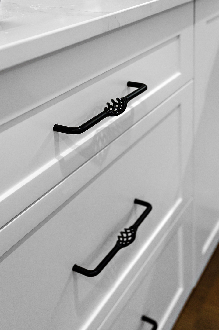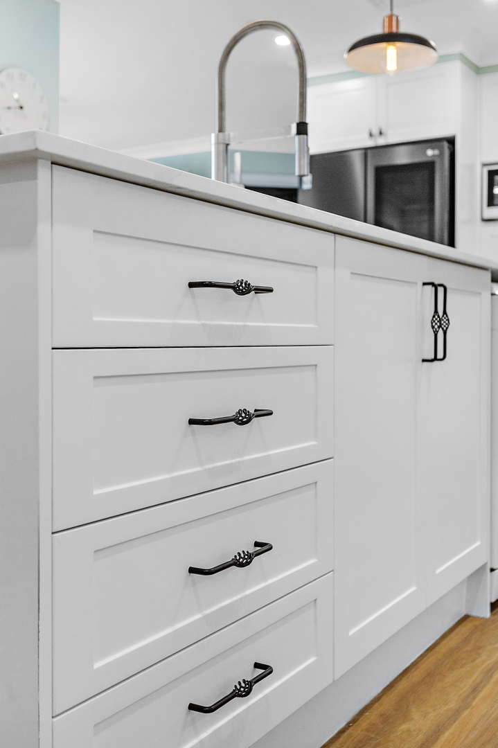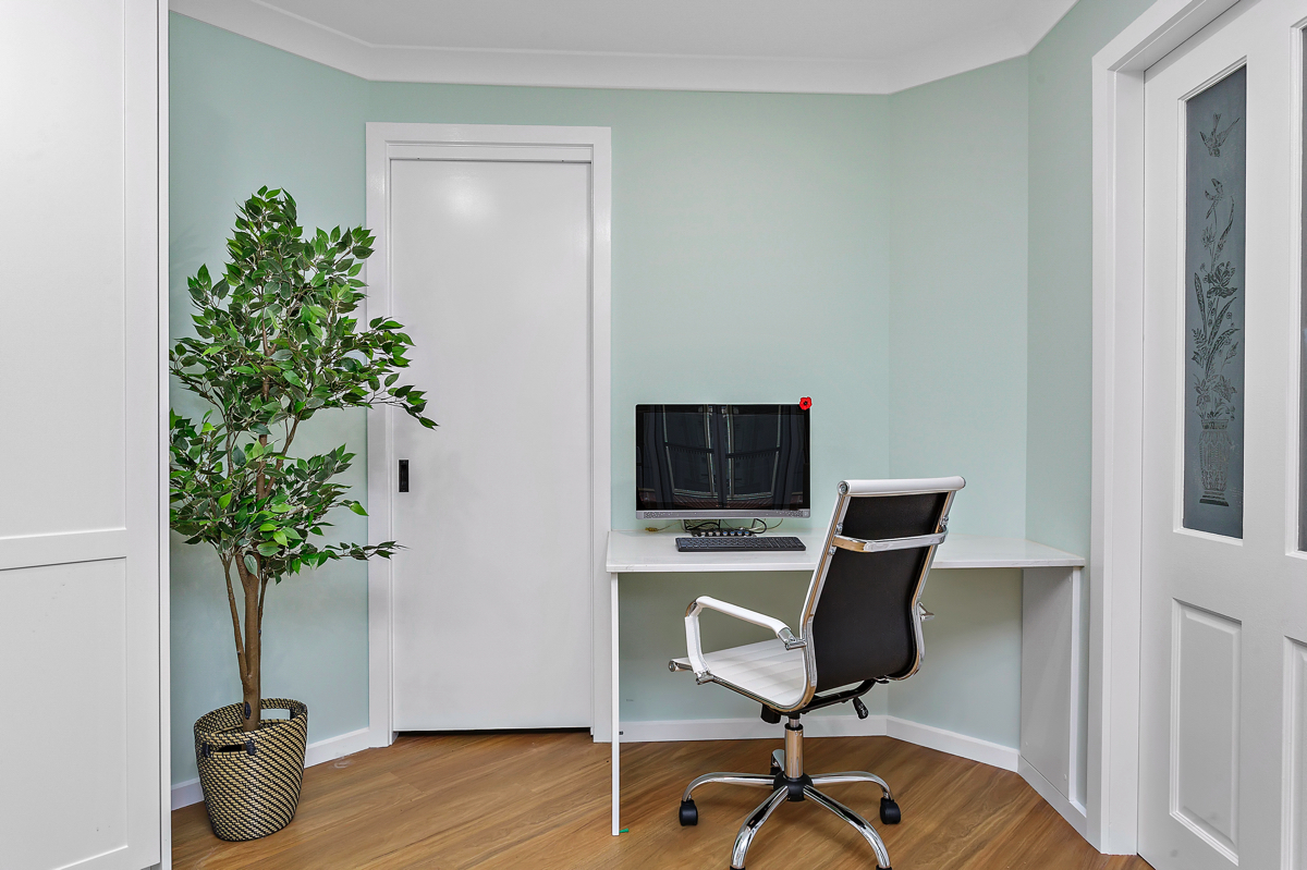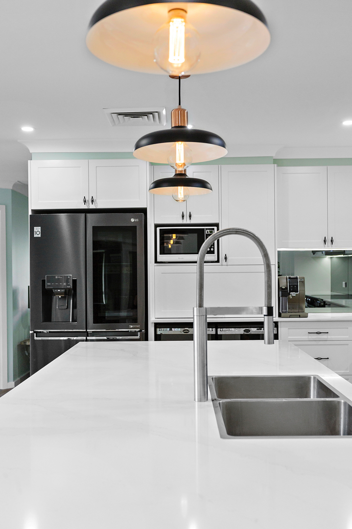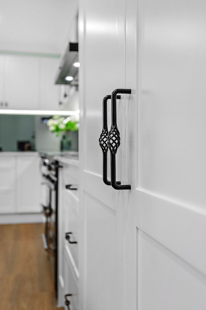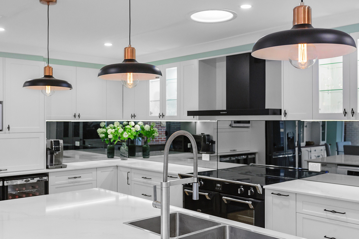 Crafted with care, this project centres on a functional, classic kitchen. Featuring elegant glass door display cabinets and a purposeful appliance cabinet, it seamlessly marries style and utility. This entertainers’ kitchen boasts a monochromatic design, complemented by a spacious island and mirrored splashback. Additionally, we optimised space by creating a home office desk in what was previously an unused corner.